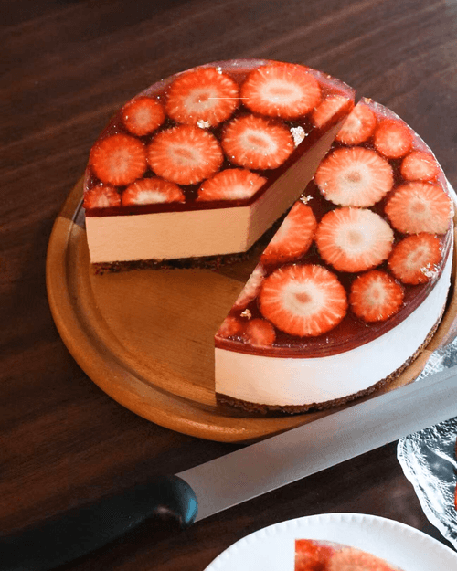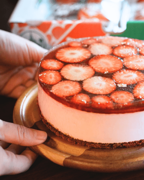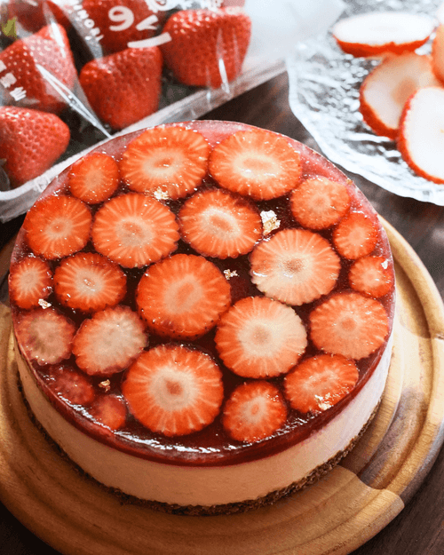嚴選來自日本福岡、帶有玫瑰清香的甜王草莓與覆盆子果肉,其風味以飽滿濃郁的草莓果香為核心,伴隨著覆盆子輕盈的酸甜氣息,尾韻則在乳酪醇厚與果香之間取得完美平衡,呈現出豐富而富有層次的味覺體驗。為的就是在製作四重結構時,頂層的「草莓果凍」能展現出透亮輕盈、一抿化開的初戀微甜;而下層的草莓玫瑰芝士蛋糕則質地綿密柔和,其中覆盆子的微酸與酥脆餅底巧妙呼應,既提升風味層次,亦中和芝士的濃郁,成就出甜潤不膩的絕妙口感。這款「極めて濃厚玫瑰草莓芝士蛋糕」每一口都充滿草莓季難忘的日系甜潤風味!